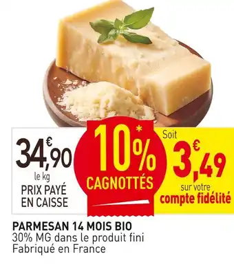 En plus de l'offre Parmesan 14 mois bio, naturéO propose une large gamme de produits. Consultez le Catalogue naturéO hebdomadaire pour découvrir les meilleures offres et promotions. En plus de Parmesan 14 mois bio, il y a aussi : Carpaccio au parmesan CHARAL, Risotto butternut et parmesan & 12 mini-cannelés au parmesan.