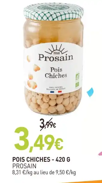 L'offre est disponible dans plusieurs magasins, vérifiez tous les produits pour obtenir le Prosain pois chiches le moins cher. Si vous souhaitez savoir si l'article est en vente avec une plus grosse remise dans un autre magasin, consultez la catégorie 'Magasins Bio'. Ces offres pourraient aussi vous intéresser : Pois chiches, Pois chiches & Bonduelle - pois chiches.