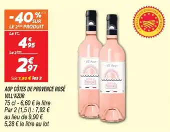 L'offre est disponible dans plusieurs magasins, vérifiez tous les produits pour obtenir le Aop côtes de provence rosé vill'azur le moins cher. Si vous souhaitez savoir si l'article est en vente avec une plus grosse remise dans un autre magasin, consultez la catégorie 'Supermarché'. Ces offres pourraient aussi vous intéresser : AOP CÔTES DE PROVENCE ROSÉ, AOP CÔTES DE PROVENCE ROSÉ BILLETTE & Billette - aop côtes de provence rose.