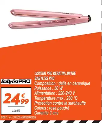 L'offre est disponible dans plusieurs magasins, vérifiez tous les produits pour obtenir le BABYLISS PRO Lisseur pro keratin lustre le moins cher. Si vous souhaitez savoir si l'article est en vente avec une plus grosse remise dans un autre magasin, consultez la catégorie 'Supermarché'. Ces offres pourraient aussi vous intéresser : Babyliss - lisseur, Airpods Pro 3 & Mandoline pro.