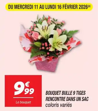 Bouquet bulle 9 tiges rencontre dans un sac bénéficie actuellement d'une réduction chez Netto. Vous trouverez ici toutes les infos utiles sur les prix, la durée de validité et les conditions de l’offre. Pensez à consulter aussi d'autres offres et promotions similaires pour Bouquet bulle 9 tiges rencontre dans un sac afin d’acheter toujours au bon prix. La promo Bouquet bulle 9 tiges rencontre dans un sac est valable du 10-02-2026 au 16-02-2026. Offre terminée ? Pas de souci. D'autres offres sur ces produits sont peut-être déjà disponibles. Vous pouvez suivre cette catégorie de produits pour rester informé en cas de nouvelle promotion Bouquet bulle 9 tiges rencontre dans un sac chez Netto. En comparant les offres, vous êtes sûr d’acheter au prix le plus bas possible.Questions fréquemment posées au sujet de Bouquet bulle 9 tiges rencontre dans un sac
