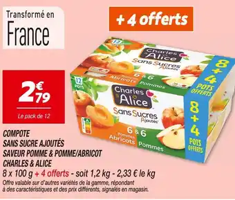 Actuellement en offre chez Netto : Charles & alice compote sans sucre ajoutés saveur pomme & pomme/abricot ✅ Valable du 2-01 au 12-01.