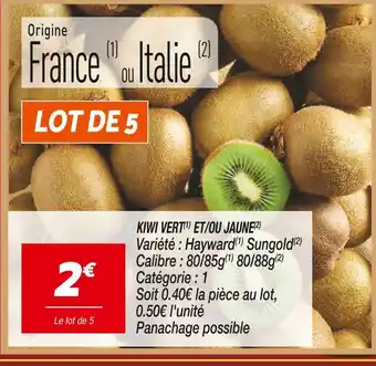 L'offre est disponible dans plusieurs magasins, vérifiez tous les produits pour obtenir le Kiwi vert et/ou jaune le moins cher. Si vous souhaitez savoir si l'article est en vente avec une plus grosse remise dans un autre magasin, consultez la catégorie 'Supermarché'. Ces offres pourraient aussi vous intéresser : Kiwi jaune, Kiwi jaune & Kiwi jaune.