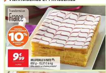 L'offre est disponible dans plusieurs magasins, vérifiez tous les produits pour obtenir le Millefeuille 6 parts le moins cher. Si vous souhaitez savoir si l'article est en vente avec une plus grosse remise dans un autre magasin, consultez la catégorie 'Supermarché'. Ces offres pourraient aussi vous intéresser : Millefeuille, Millefeuille & Millefeuille.
