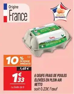Actuellement en offre chez Netto : Netto - 6 oeufs frais de poules élevées en plein air ✅ Valable du 10-02 au 16-02.