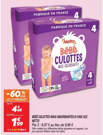 Actuellement en offre chez Netto : Netto bébé culottes maxi absorbantes 8/15kg x22 ✅ Valable du 21-04 au 27-04.
