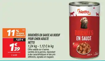 Actuellement en offre chez Netto : Netto bouchées en sauce au boeuf pour chien adulte ✅ Valable du 10-03 au 16-03.