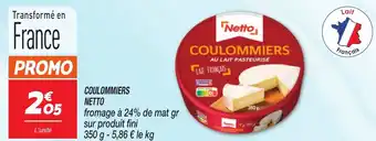 En plus de l'offre NETTO Coulommiers, Netto propose une large gamme de produits. Consultez le Catalogue Netto hebdomadaire pour découvrir les meilleures offres et promotions. En plus de NETTO Coulommiers, il y a aussi : PRESIDENT Coulommiers, Président coulommiers & Lot de 2 Coulommiers.