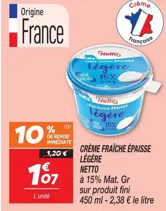 Actuellement en offre chez Netto : Netto crème fraîche épaisse légère ✅ Valable du 10-02 au 16-02.
