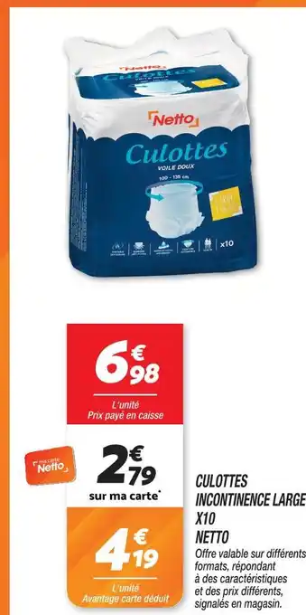 Actuellement en offre chez Netto : Netto culottes incontinence large x10 ✅ Valable du 10-02 au 16-02.