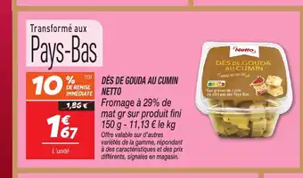 Cette NETTO Dés de gouda au cumin est disponible dans les magasins ci-dessous en fonction de votre emplacement configuré: