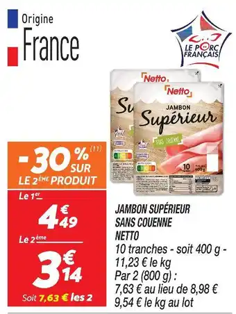 Actuellement en offre chez Netto : Netto jambon supérieur sans couenne ✅ Valable du 3-02 au 16-02.