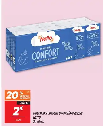 En plus de l'offre Netto mouchoirs confort quatre épaisseurs, Netto propose une large gamme de produits. Consultez le Catalogue Netto hebdomadaire pour découvrir les meilleures offres et promotions. En plus de Netto mouchoirs confort quatre épaisseurs, il y a aussi : Mouchoirs confort quatre épaisseurs netto, Mouchoirs Confort CARREFOUR SOFT & Mouchoirs Doux et Épais 4 Épaisseurs U.