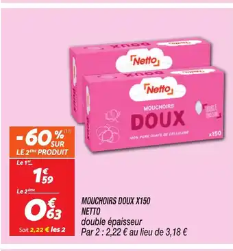 Actuellement en offre chez Netto : NETTO Mouchoirs doux x150 ✅ Valable du 24-02 au 2-03.