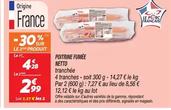 Actuellement en offre chez Netto : Netto poitrine fumée tranchée ✅ Valable du 17-02 au 23-02.