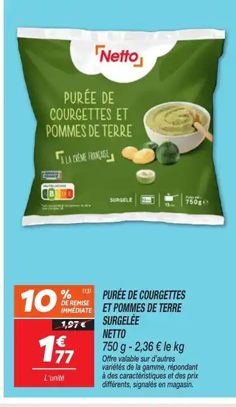 Actuellement en offre chez Netto : NETTO Purée de courgettes et pommes de terre surgelée ✅ Valable du 13-01 au 19-01.