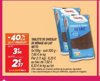 Actuellement en offre chez Netto : NETTO Tablette de chocolat de ménage au lait ✅ Valable du 24-03 au 31-03.