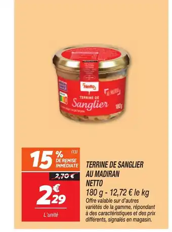 Actuellement en offre chez Netto : NETTO Terrine de sanglier au madiran ✅ Valable du 24-02 au 2-03.