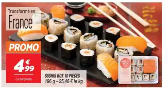 L'offre est disponible dans plusieurs magasins, vérifiez tous les produits pour obtenir le Sushis box 10 pieces le moins cher. Si vous souhaitez savoir si l'article est en vente avec une plus grosse remise dans un autre magasin, consultez la catégorie 'Supermarché'. Ces offres pourraient aussi vous intéresser : Sushis box, Kai plateau de sushis & Plateau de sushis Kai.