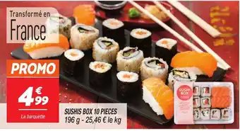 L'offre est disponible dans plusieurs magasins, vérifiez tous les produits pour obtenir le Sushis box le moins cher. Si vous souhaitez savoir si l'article est en vente avec une plus grosse remise dans un autre magasin, consultez la catégorie 'Supermarché'. Ces offres pourraient aussi vous intéresser : Sushis box 10 pieces, Kai plateau de sushis & Plateau de sushis Kai.