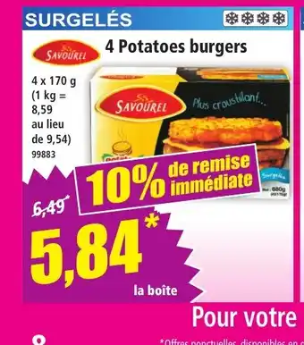 L'offre est disponible dans plusieurs magasins, vérifiez tous les produits pour obtenir le 4 Potatoes burgers le moins cher. Si vous souhaitez savoir si l'article est en vente avec une plus grosse remise dans un autre magasin, consultez la catégorie 'Bazar et Déstockage'. Ces offres pourraient aussi vous intéresser : Savourel 4 potatoes burgers, E.leclerc - potatoes surgelées & 28 burgers apéritif cheese.