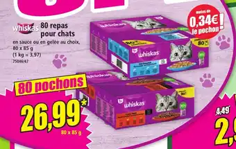 L'offre est disponible dans plusieurs magasins, vérifiez tous les produits pour obtenir le 80 repas pour chats le moins cher. Si vous souhaitez savoir si l'article est en vente avec une plus grosse remise dans un autre magasin, consultez la catégorie 'Bazar et Déstockage'. Ces offres pourraient aussi vous intéresser : KITEKAT 48 repas en sauce pour chats, WHISKAS 60 repas en sauce pour chats & Sachet repas pour chats stérilisé ULTIMA.
