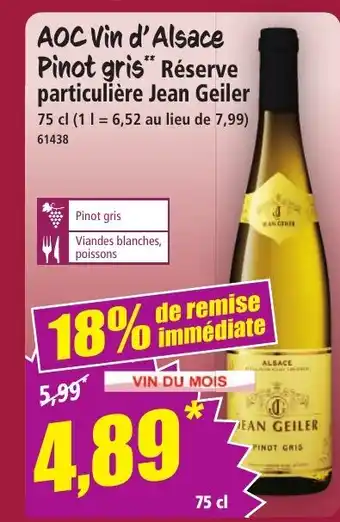 Actuellement en offre chez Norma : AOC Vin d'Alsace Pinot gris Réserve particulière Jean Geiler ✅ Valable du 4-02 au 10-02.