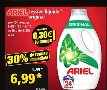 Actuellement, ARIEL Lessive liquide original est en promotion chez Norma. Toutes les informations utiles comme le prix, les conditions et la durée de validité sont affichées sur cette page. Consultez également les promotions similaires pour ARIEL Lessive liquide original, afin de faire le meilleur choix. La promo ARIEL Lessive liquide original est valable du 22-04-2026 au 28-04-2026. Si elle est expirée, regardez les autres offres équivalentes. Vous pouvez aussi suivre cette catégorie de produit pour être alerté lorsqu’une nouvelle promotion ARIEL Lessive liquide original apparaît chez Norma.Questions fréquemment posées au sujet de ARIEL Lessive liquide original