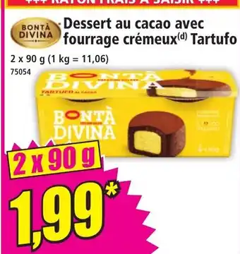 Actuellement en offre chez Norma : BONTA DIVINA Dessert au cacao avec fourrage crémeux Tartufo ✅ Valable du 25-02 au 3-03.