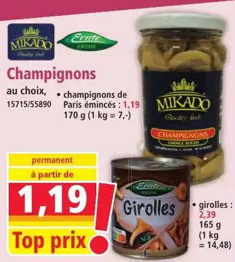 L'offre est disponible dans plusieurs magasins, vérifiez tous les produits pour obtenir le Champignons le moins cher. Si vous souhaitez savoir si l'article est en vente avec une plus grosse remise dans un autre magasin, consultez la catégorie 'Bazar et Déstockage'. Ces offres pourraient aussi vous intéresser : Champignons, Champignons de Paris & Champignons Blancs.