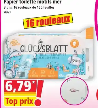 Actuellement en offre chez Norma : Glücksblatt papier toilette motifs mer ✅ Valable du 28-01 au 3-02.