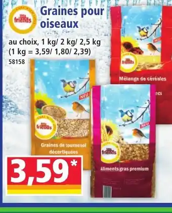 Quand Graines pour oiseaux sera-t-elle en promotion ? Ou encore : "Est-ce que Graines pour oiseaux sera en promotion la semaine prochaine ?" C’est une question fréquente. Beaucoup de consommateurs établissent leur liste de courses à l’avance. Pour cette raison, nous mettons en ligne les informations sur les promos à venir dès qu’elles sont connues. Cela vous permet de planifier vos achats et de faire de bonnes affaires. Consultez régulièrement notre site pour savoir si une nouvelle promo sur Graines pour oiseaux arrive bientôt chez Norma.Questions fréquemment posées au sujet de Graines pour oiseaux
