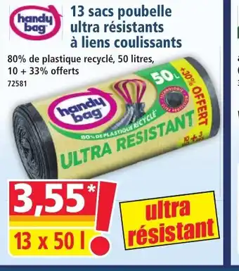 Actuellement en offre chez Norma : HANDY BAG 13 sacs poubelle ultra résistantss à liens coulissants ✅ Valable du 22-12 au 28-12.