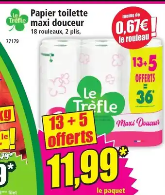 Actuellement en offre chez Norma : LE TRÈFLE Papier toilette Trèfle maxi douceur ✅ Valable du 21-01 au 27-01.