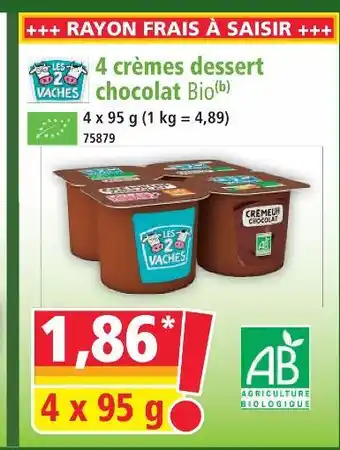 En plus de l'offre Les 2 vaches 4 crèmes dessert chocolat bio, Norma propose une large gamme de produits. Consultez le Catalogue Norma hebdomadaire pour découvrir les meilleures offres et promotions. En plus de Les 2 vaches 4 crèmes dessert chocolat bio, il y a aussi : LES 2 VACHES Crème dessert Bio chocolat, Yaourt chocolat bio crèmeuh les 2 vaches & Lot de 12 crèmes dessert Elle & Vire.