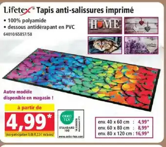 L'offre est disponible dans plusieurs magasins, vérifiez tous les produits pour obtenir le LIFETEX Tapis anti-salissures imprimé le moins cher. Si vous souhaitez savoir si l'article est en vente avec une plus grosse remise dans un autre magasin, consultez la catégorie 'Bazar et Déstockage'. Ces offres pourraient aussi vous intéresser : LIFETEX XXL Tapis anti-salissures, LIFETEX XL Tapis anti-salissures & LIFETEX Tapis Promenade.