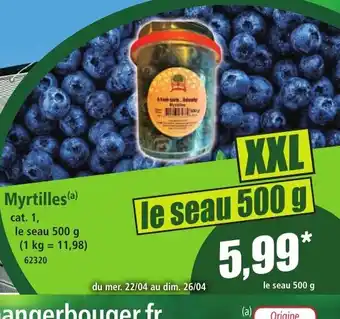 Myrtilles bénéficie actuellement d'une réduction chez Norma. Vous trouverez ici toutes les infos utiles sur les prix, la durée de validité et les conditions de l’offre. Pensez à consulter aussi d'autres offres et promotions similaires pour Myrtilles afin d’acheter toujours au bon prix. La promo Myrtilles est valable du 22-04-2026 au 28-04-2026. Offre terminée ? Pas de souci. D'autres offres sur ces produits sont peut-être déjà disponibles. Vous pouvez suivre cette catégorie de produits pour rester informé en cas de nouvelle promotion Myrtilles chez Norma. En comparant les offres, vous êtes sûr d’acheter au prix le plus bas possible.Questions fréquemment posées au sujet de Myrtilles
