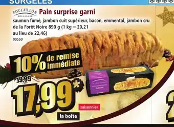 L'offre est disponible dans plusieurs magasins, vérifiez tous les produits pour obtenir le POULAILLON Pain surprise garni le moins cher. Si vous souhaitez savoir si l'article est en vente avec une plus grosse remise dans un autre magasin, consultez la catégorie 'Bazar et Déstockage'. Ces offres pourraient aussi vous intéresser : Pain de campagne garni, Pain de campagne garni & Pain campagnard garni.
