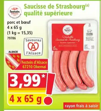 En plus de l'offre Saucisse de Strasbourg (a) qualité supérieure, Norma propose une large gamme de produits. Consultez le Catalogue Norma hebdomadaire pour découvrir les meilleures offres et promotions. En plus de Saucisse de Strasbourg (a) qualité supérieure, il y a aussi : STŒFFLER Saucisse de strasbourg porc et boeuf, SAUCISSE DE STRASBOURG PORC ET BOEUF STEFFLER & Jambon cuit de qualité supérieure.