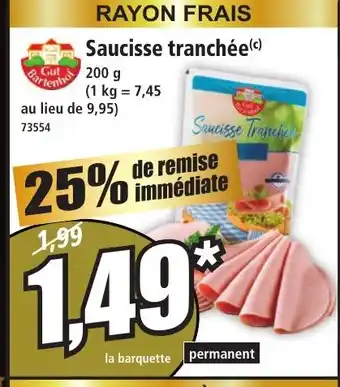 Quand Saucisse tranchée sera-t-elle en promotion ? Ou encore : "Est-ce que Saucisse tranchée sera en promotion la semaine prochaine ?" C’est une question fréquente. Beaucoup de consommateurs établissent leur liste de courses à l’avance. Pour cette raison, nous mettons en ligne les informations sur les promos à venir dès qu’elles sont connues. Cela vous permet de planifier vos achats et de faire de bonnes affaires. Consultez régulièrement notre site pour savoir si une nouvelle promo sur Saucisse tranchée arrive bientôt chez Norma.Questions fréquemment posées au sujet de Saucisse tranchée