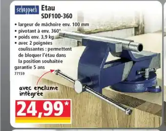 En plus de l'offre SCHEPPACH Etau SDF100-360, Norma propose une large gamme de produits. Consultez le Catalogue Norma hebdomadaire pour découvrir les meilleures offres et promotions. En plus de SCHEPPACH Etau SDF100-360, il y a aussi : SCHEPPACH Enclume SAB450, Scheppach kit d’outils & SCHEPPACH Scarificateur électrique 1500 w.