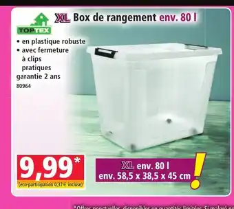 Le prix de l'offre TOPTEX XL Box de rangement se trouve également en haut de la page, ainsi que la date à laquelle l'offre est disponible. Vous pouvez également vérifier les prix dans le Catalogue Norma actuel ou sur le site Internet de Norma. Les offres vous permettent d'acheter les produits Norma au prix le plus bas.