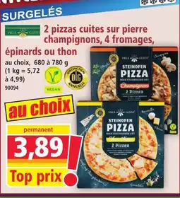 VILLA CUSTO 2 pizzas cuites sur pierre champignons, 4 fromages, épinards ou thon