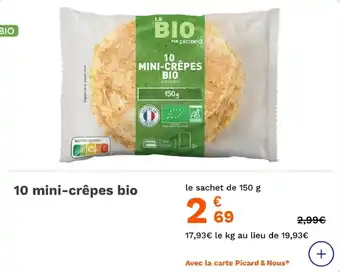 En plus de l'offre 10 mini-crêpes bio, Picard propose une large gamme de produits. Consultez le Catalogue Picard hebdomadaire pour découvrir les meilleures offres et promotions. En plus de 10 mini-crêpes bio, il y a aussi : Mini crêpes party 4 personnes, 4 crepes fourrees/6 crepes nature & 6 crêpes bretonnes.