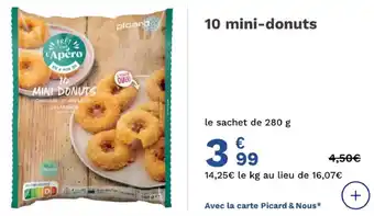 En plus de l'offre 10 mini-donuts, Picard propose une large gamme de produits. Consultez le Catalogue Picard hebdomadaire pour découvrir les meilleures offres et promotions. En plus de 10 mini-donuts, il y a aussi : 10 mini donuts, 9 mini donuts carnaval & Donuts - 12 au chocolat.