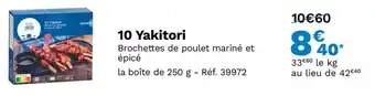 L'offre est disponible dans plusieurs magasins, vérifiez tous les produits pour obtenir le 10 yakitori le moins cher. Si vous souhaitez savoir si l'article est en vente avec une plus grosse remise dans un autre magasin, consultez la catégorie 'Supermarché'. Ces offres pourraient aussi vous intéresser : 10 yakitori, poulet mariné à la sauce soja, AJINOMOTO Yakitori surgelé poulet sauce teriyaki & AJINOMOTO Yakitori surgelé poulet sauce teriyaki.