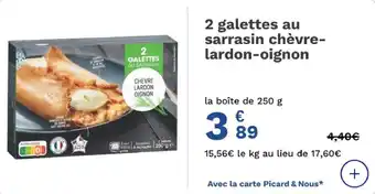 En plus de l'offre 2 galettes au sarrasin chèvre lardon-oignon, Picard propose une large gamme de produits. Consultez le Catalogue Picard hebdomadaire pour découvrir les meilleures offres et promotions. En plus de 2 galettes au sarrasin chèvre lardon-oignon, il y a aussi : Galette ble chevre lardon, 4 Galettes au Sarrasin 'Nos Régions Ont du Talent' & 2 galettes au sarrasin jambon emmental.