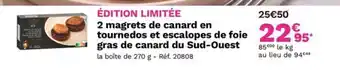L'offre est disponible dans plusieurs magasins, vérifiez tous les produits pour obtenir le 2 magrets de canard en tournedos et escalopes de foie gras de canard du Sud-Ouest le moins cher. Si vous souhaitez savoir si l'article est en vente avec une plus grosse remise dans un autre magasin, consultez la catégorie 'Supermarché'. Ces offres pourraient aussi vous intéresser : Bloc de foie gras de canard IGP du Sud-Ouest, Canard - bloc de foie gras de igp du sud-ouest & Canard - foie gras frais de extra igp du sud-ouest.