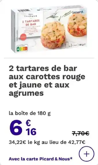 Le prix de l'offre 2 tartares de bar aux carottes rouge et jaune et aux agrumes se trouve également en haut de la page, ainsi que la date à laquelle l'offre est disponible. Vous pouvez également vérifier les prix dans le Catalogue Picard actuel ou sur le site Internet de Picard. Les offres vous permettent d'acheter les produits Picard au prix le plus bas.