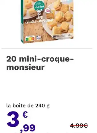 L'offre est disponible dans plusieurs magasins, vérifiez tous les produits pour obtenir le 20 mini-croque- monsieur le moins cher. Si vous souhaitez savoir si l'article est en vente avec une plus grosse remise dans un autre magasin, consultez la catégorie 'Supermarché'. Ces offres pourraient aussi vous intéresser : 20 Mini croque-monsieur, 20 Mini Croque-Monsieur jambon Emmental & Croque monsieur brasserie.